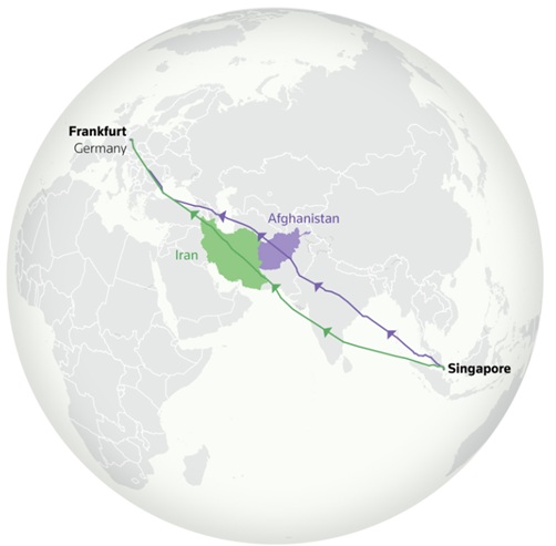 له دې امله، هوايي شرکتونه د اروپا او آسيا تر منځ د تګ راتګ لپاره د خوندي او مناسبو لارو له محدودیت سره مخامخ شوي دي. خو يوه نوې لاره پيدا شوې افغانستان. هغه فضا چې د څو لسيزو جګړو له امله به تل پرې الوتکو له تېرېدو ډډه کوله، اوس د طالبانو د نسبي ثبات له کبله د افغانستان فضا لږ خطرناکه ګڼل کېږي. ډېر هوايي شرکتونه د ايران او نورو کړکېچنو سيمو پر ځای د افغانستان له هوايي فضا (په لاندې نقشه کې) کار اخلي. د FAA له خوا په ۲۰۲۳ کې د افغانستان پر فضا له ۲۰۲۱ وروسته بنديزونه نرم شول. کله چې طالبان واک ته ورسېدل، هوايي ترافيک کنټرول بند شو او شرکتونه افغانستان ته نه ورتلل، خو د ايران او اسرائيل تر منځ د توغنديو او ډرون جګړو د هوايي فضا کارول ستونزمن کړل. اوس FAA امريکايي الوتکو ته د افغانستان په شمال ختيځ (واخان دهلېز) کې د يوې نرۍ لارې اجازه ورکړې. اروپايي ادارې هم په دې مسیر کې په لوړه ارتفاع پروازونه منلي دي.