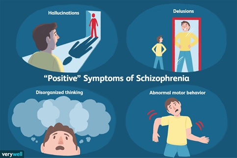 د سکیزوفرینیا وصفي اعراض دا دي چې ناروغ هالوسینیشن پیدا کوي یعنی دا چې ناروغ په خپل سر غږونه اوري او بیا هماغو غږونو ته په ځواب ویلو سره گډ وي.