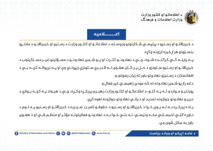 تاند ( دوشنبه د سلواغې ـ دلوې ۶مه) د طالبانو د حکومت د اطلاعاتو او کلتور وزارت وايي، چې د خبريالانو او رسنيو د پرلپسې شکايتونو له ترلاسه کېدو وروسته يې د رسنيو او خبريالانو د ملاتړو بنسټونو هر اړخيزه ارزونه کړې ده.