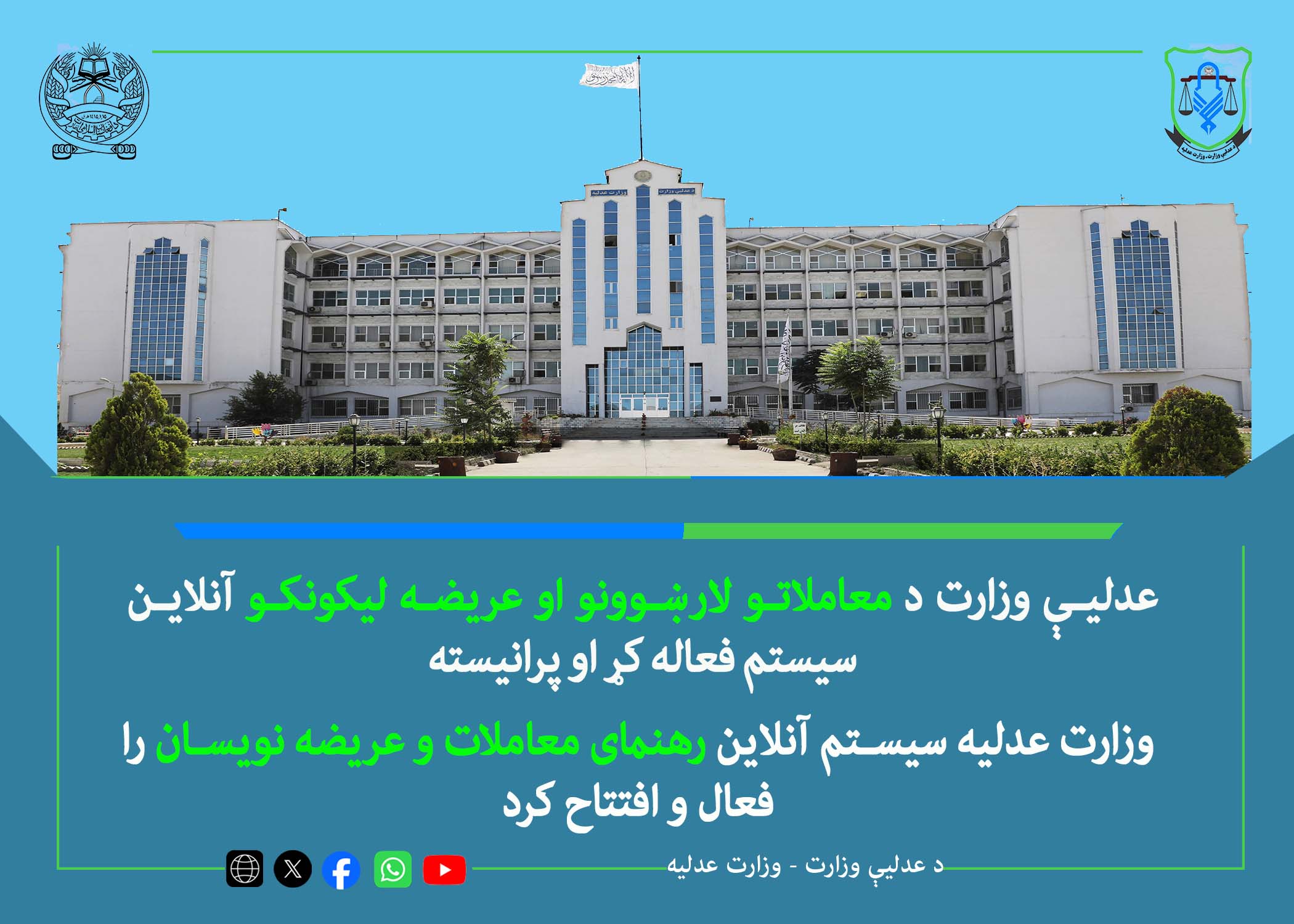 تاند ( سه شنبه د سلواغې ـ دلوې ۲۱مه) د طالبانو عدلیې وزارت اعلان وکړ چې د معاملو لارښودنو او عریضه کوونکو لپاره یې انلاین سیسټم فعال کړی چې موخه یې د روڼتیا زیاتول، د جوازونو د صادرولو او د املاکو او وسایطو د معاملو د ثبت د پروسې اسانه کول دي.